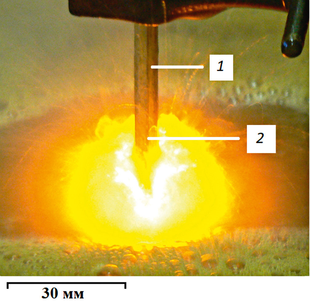 Рис. 2. Фотография электрического разряда между металлическим катодом и жидким (неметаллическим) анодом при атмосферном давлении. Цифры 1 и 2 соответствуют областям, обозначенным на рис. 3