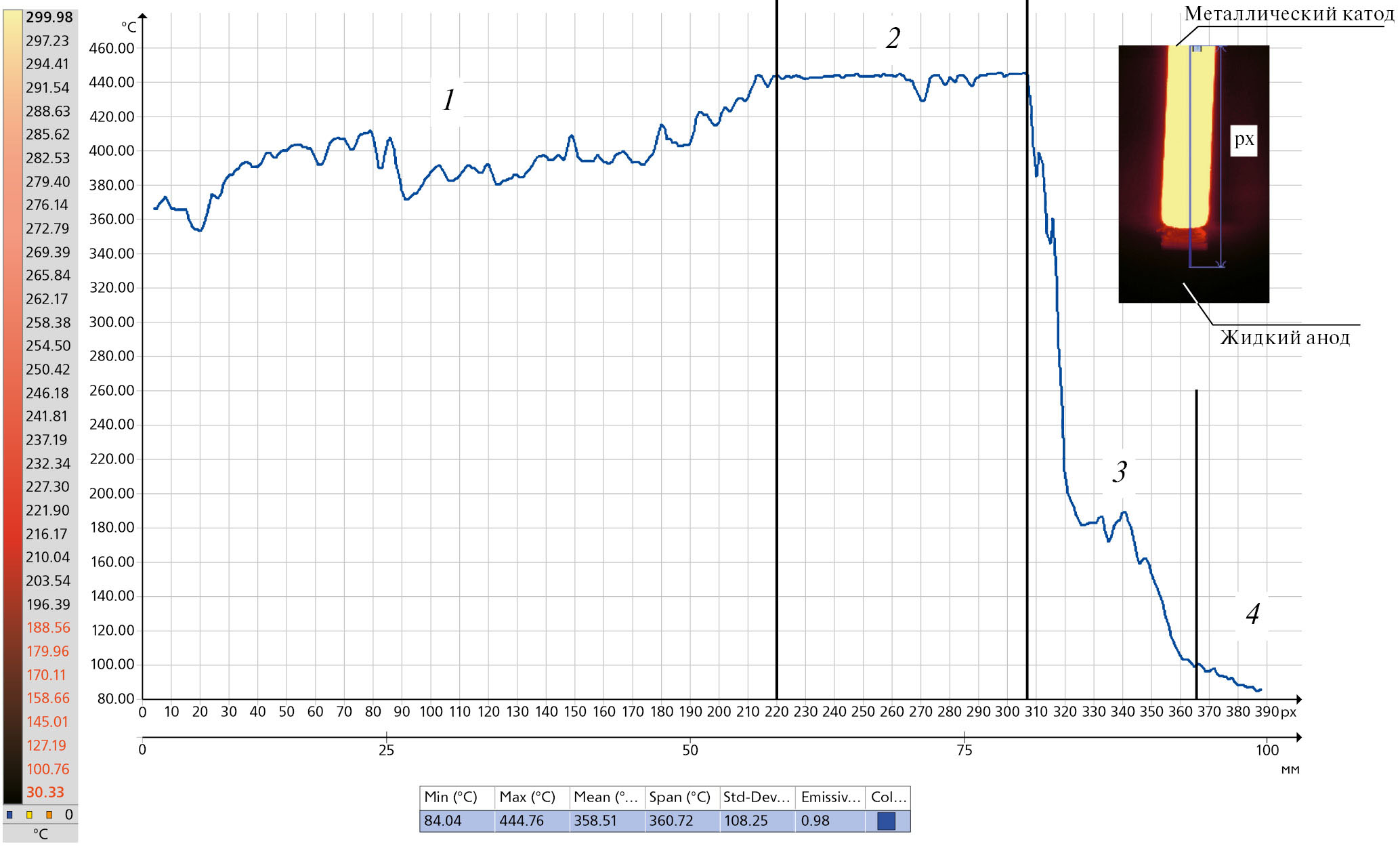 Рис. 3. Термограмма поверхности металлического катода и жидкого (неметаллического) анода в условиях горения электрического разряда: 1 – поверхность металлического катода вне разряда, 2 – поверхность металлического катода в области разряда, 3 – межэлектродный промежуток, 4 – поверхность жидкого анода