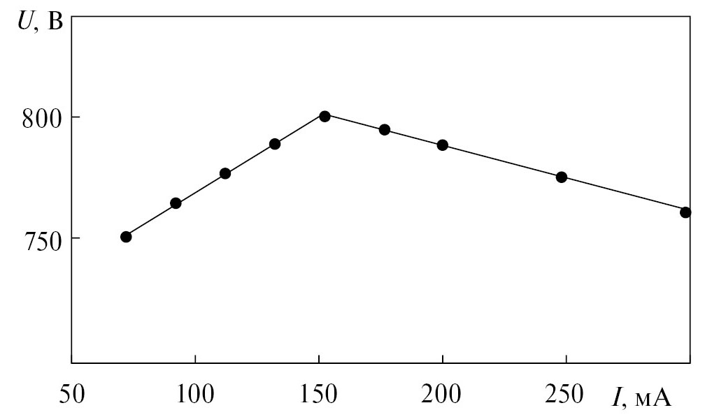 Построена вольтамперная характеристика (ВАХ) разряда после подъема и фиксации положения металлического катода над поверхностью жидкого анода (рис. 4). Из графика видно, что в интервале тока от 75–150 мА величина U растет, а с возрастанием от 150 до 300 мА ВАХ разряда имеет падающий характер. Такое развитие объясняется тем, что с увеличением тока меняется баланс процессов рождения и гибели электронов в положительном столбе плазмы.