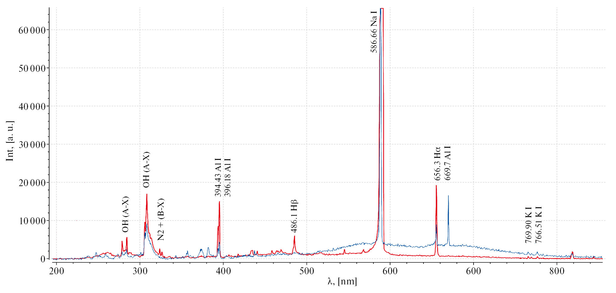 Рис. 5. Спектр электрического разряда между металлическим катодом и жидким анодом (синий график) и металлическим анодом и жидким катодом (красный график) при атмосферном давлении