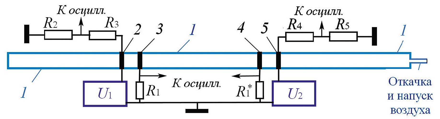 Напряжение между электродами в каждой паре измеряли делителями AKTAKOM ACA-6039 с полосой пропускания 50 МГц. Величины сопротивлений делителей R2 = R5 = 900 кОм, а R3 = R4 = 900 МОм. Токи разряда измеряли шунтами с сопротивлением 3 Ом, которые устанавливались последовательно с заземленными электродами. Высоковольтные электроды 2 и 5 специально экранировали друг от друга заземленными электродами 3 и 4.