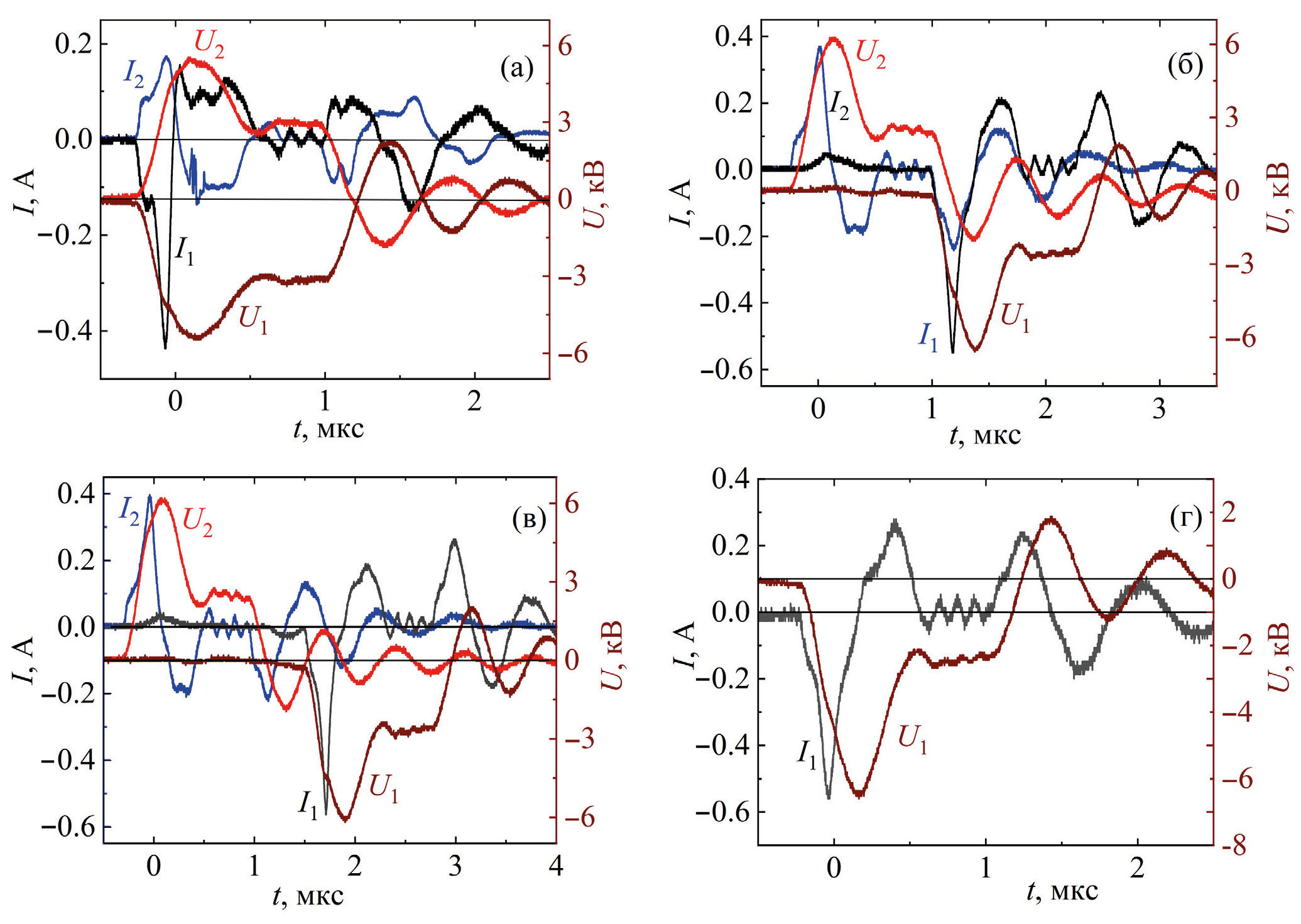 Основное внимание было уделено исследованиям столкновения ПДС при различных полярностях их фронта и вариации задержки между включением генераторов. На кольцевые электроды 2, 3 и 4, 5 подавались импульсы напряжения одинаковой формы от двух генераторов U1 и U2. На рис. 2 приведены импульсы тока и напряжения с включением генератора U1, который расположен слева, при отрицательной полярности, и второго U2, расположенного справа, — при положительной, с различными задержками при их запуске.