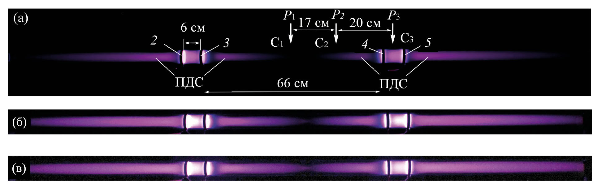 При включении одного из генераторов интенсивность излучения разряда ПДС в центральной части трубки уменьшалась по сравнению с режимом разных полярностей двух генераторов, а в области между высоковольтным электродом и ближайшим к нему торцом трубки интенсивность излучения увеличивалась. На рис. 3в показано свечение ПДС между электродом 5 и правым торцом трубки при включении одного генератора U2.