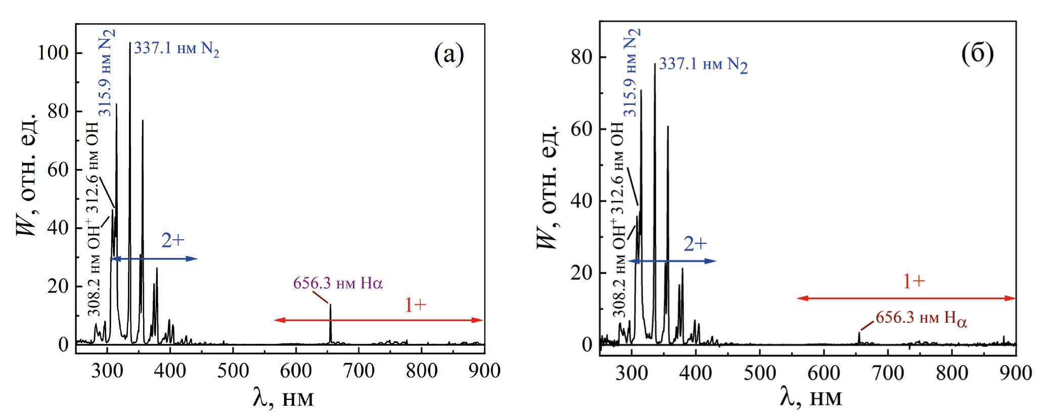 Рис. 5. Спектры излучения ПДС из области между электродами 4 и 5, отмеченной стрелкой С3 на рис. 4, при различной полярности генераторов и их одновременном запуске (а), а также при задержке включения генератора U1 на 1.25 мкс (б). 2+ — область спектра с наиболее интенсивными полосами второй положительной системы азота, в там числе 337.1 и 315.9 нм; 308.2 и 312.6 нм — максимумы полос молекул OH+ и OH с красным оттенением; Hα — линия атомарного водорода с длиной волны 656.3 нм, 1+ — область спектра с наиболее интенсивными полосами первой положительной системы азота. Давление воздуха p = 1 Торр, U1 = –7 кВ, U2 = +7 кВ. Экспозиции 3 с (а) и 20 с (б)
