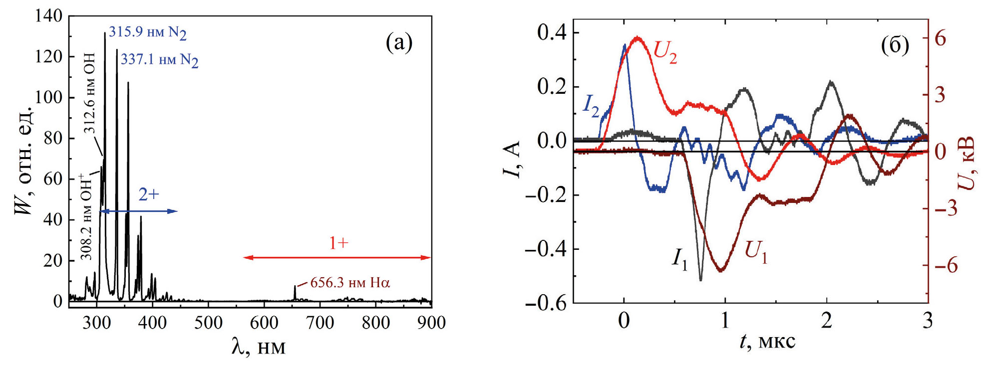 Рис. 6. Спектр излучения ПДС из области С1 между электродами 3 и 4 при различной полярности генераторов и задержке включения генератора U1 на 830 нс (а), а также осциллограммы тока и напряжения для этого режима (б). 2+ — область спектра с наиболее интенсивными полосами второй положительной системы азота; 308.2 и 312.6 нм — полосы молекул OH+ и OH с красным оттенением; Hα — линия атомарного водорода с длиной волны 656.3 нм, 1+ — область с наиболее интенсивными полосами первой положительной системы азота. Давление воздуха p = 1 Торр, U1 = –7 кВ, U2 = +7 кВ. Экспозиции 20 с (а)