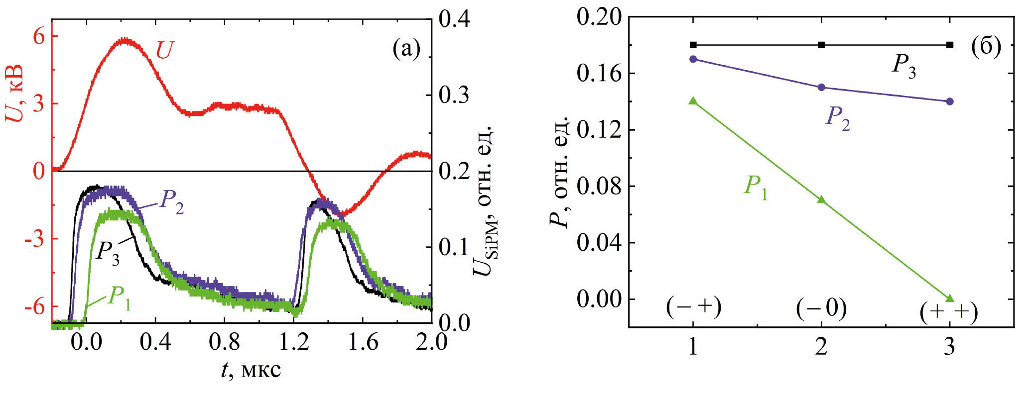 Как и в работе [12], из ПДС регистрировали импульсы излучения двух стримеров, которые генерировались в областях С1 и С2 в результате действия разнополярных пиков тока на фронте и спаде импульсов напряжения. На рис. 7 приведены импульс напряжения от генератора U1, импульсы излучения P1, P2 и P3 соответственно из областей С1, С2 и С3 при одновременном включении двух генераторов разной полярности (–U1 и +U2), а также максимальные амплитуды импульсов излучения P1, P2 и P3 при различных режимах.