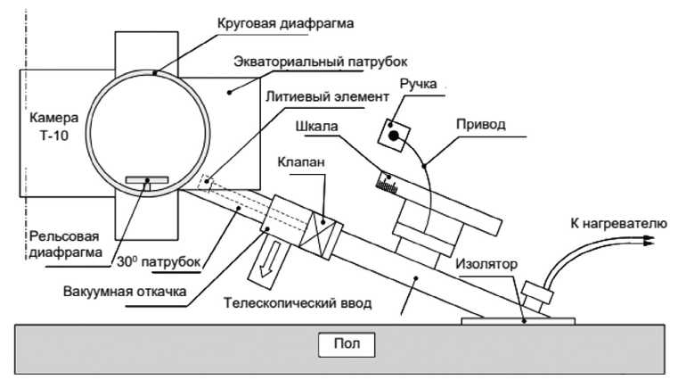 Литий располагался в специальном контейнере и растекался благодаря капиллярному давлению по КПС, расположенной на наружной фронтальной поверхности элемента. Элемент был снабжен нагревателем и термопарами для измерения температуры. Он вводился в центр камеры токамака Т-10 через 30-градусный патрубок до начала разрядов в том же сечении, где располагались рельсовая и кольцевая диафрагмы. Схема эксперимента показана на рис. 1.