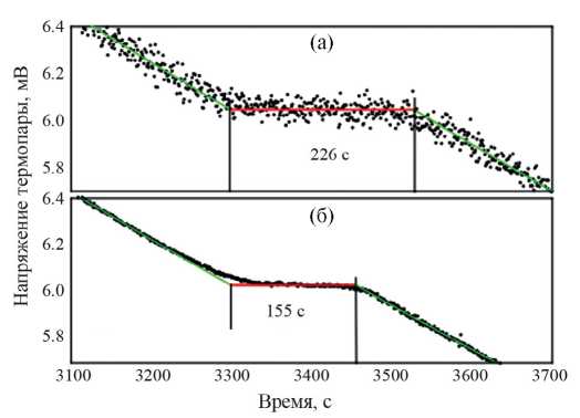 Рис. 2. Определение количества лития по длительности плато температуры: а — до эксперимента; б — после пяти литиизаций.