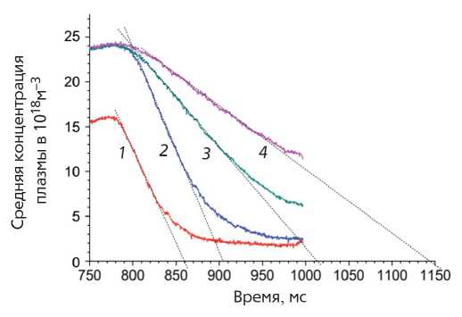 Рис. 3. Эволюция во времени средней плотности плазмы после отключения клапана в серии разрядов после литиизации: 1– первый разряд после литиизации (61390); 2– второй разряд после литиизации (61391); 3 — десятый разряд после литиизации (61399); 4 — двадцать третий разряд после литиизации (61412).