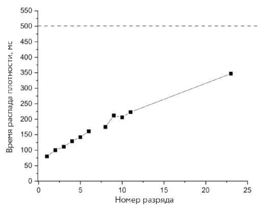 Рис. 4. Изменение времени распада плотности в серии разрядов после литиизации.