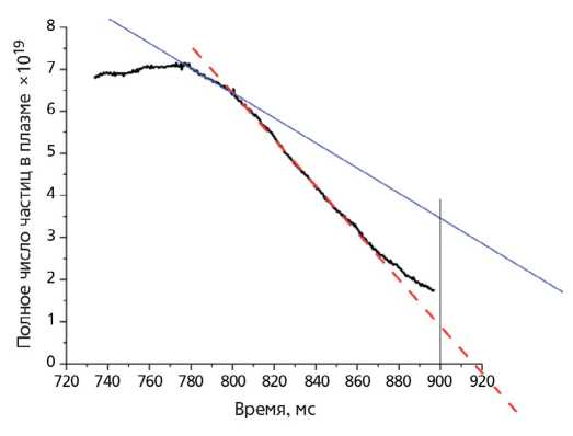 На рис. 5 приведен ход во времени полного количества частиц в плазме для второго импульса после литиизации. Полное число частиц находилось суммированием хордовых данных 16-канального интерферометра. Видно, что полное число частиц начинает уменьшаться со скоростью 3⋅1020 част/с, но через 25 мс скорость распада увеличивается до 5.7⋅1020 част/с, что может свидетельствовать о ухудшении удержания плазмы. Ухудшение удержания в условиях низкого (0.3) рециклинга с подпиткой инжекцией пеллет было обнаружено на токамаке ASDEX [20]. Также об ухудшении удержания плазмы свидетельствует значительное увеличение уровня флуктуаций плотности, обнаруженное в этом разряде в стадии распада плотности [21].