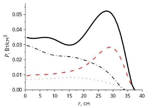 Рис. 6. Радиальные распределения потерь, регистрируемые пироэлектрическим болометром и датчиками AXUV в разрядах до и после литиевого напыления. Сплошная черная линия –пироэлектрический болометр до литиизации; красный пунктир — после литиизации; — черный пунктир с точками — AXUV до литиизации; красная точечная линия — AXUV после литиизации.