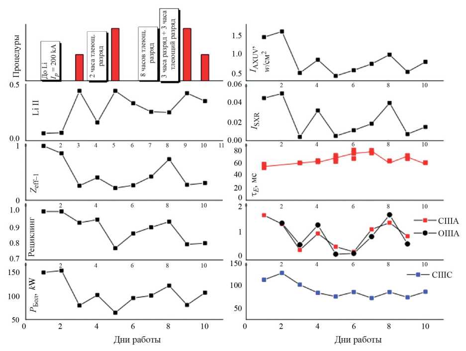 На рис. 7 приведено изменение параметров плазмы в течение экспериментальной кампании с литием 2008 г. Параметры плазмы измерялись в первых импульсах рабочего дня. На левом верхнем графике приведены названия процедур, проделанных перед началом эксперимента каждого дня. Красными столбиками отмечены процедуры литиизации, причем их высота соответствует длительности напыления 10 и 20 мин. Перед остальными рабочими днями литий не напылялся, но проводились различные процедуры чистки камеры, отмеченные на рисунке.