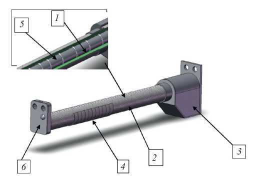 Рис. 9. Конструкция литиевой диафрагмы. 1 — слой лития, пропитывающего молибденовую сетку; 2 — молибденовая сетка; 3 — контейнер с литием; 4 — слой вольфрамового войлока; 5 — молибденовая трубка с нагревателем; 6 — крепежный кронштейн.