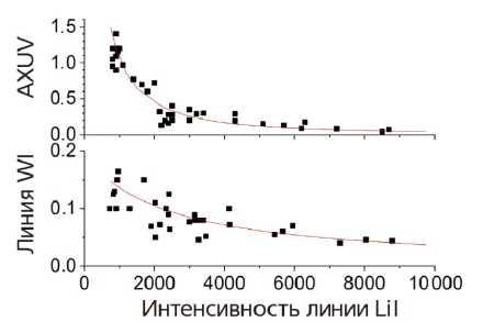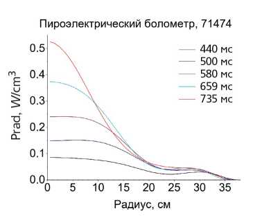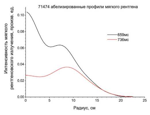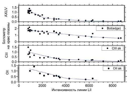 На рис. 36 приведены профили хордовых сигналов пироэлектрических болометров и полупроводниковых датчиков AXUV для разряда с доминированием лития. Видно, сигналы AXUV мало меняются по хордам, в то время как сигналы болометра скинированы.
