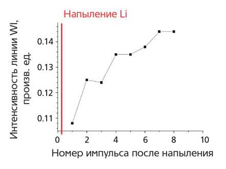 После достижения вакуума в устройстве ввода проводилась подготовка элемента путем длительного прогрева литиевого элемента с температурой до 200 оС для обезгаживания после атмосферы чтобы не вносить примеси в камеру при напылении. Для распыления лития в камере литиевый элемент вводился в середину камеры и выдерживался при температуре 450 оC в течение 20 мин. Типичное количество осажденного в камере лития составляло около одного грамма. Оно контролировалось путем изменения продолжительности температурного плато в процессе охлаждения элемента. Такая методика была предложена в [19].