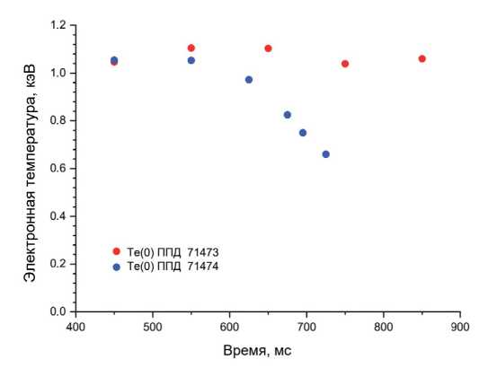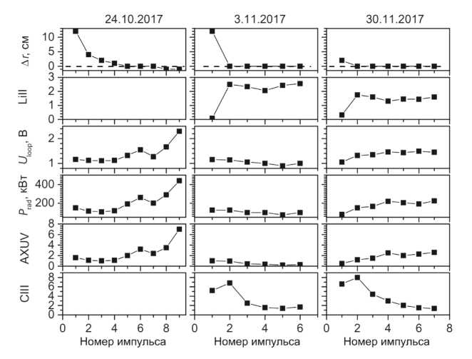 Работа проводилась в постоянном режиме с током плазмы Jp = 200 kA, тороидальным магнитным полем Bt = 2.4 Tл и средней плотностью <Ne> = 2.5⋅1019м−3. Поскольку рециклинг и примесный состав разряда менялись в течение дня, то на рисунке приведены данные, соответствующие первому импульсу, в котором плотность выходила на заданный уровень. Это практически достигалось во втором импульсе.