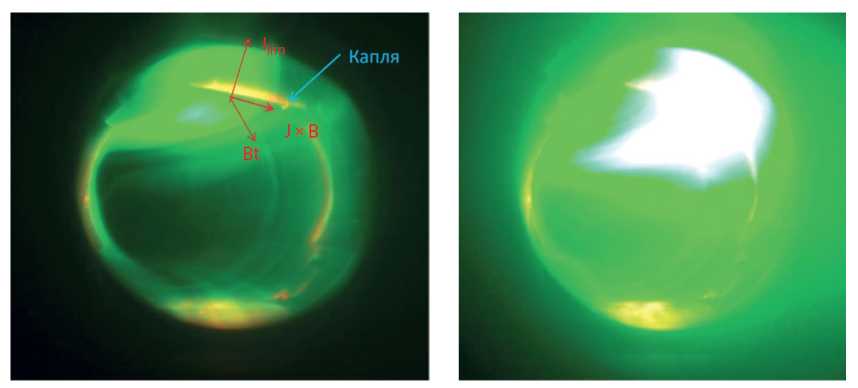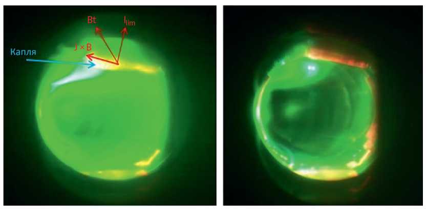 Однако в одной серии литиевый элемент был выведен из камеры, но остался в горячем состоянии внутри патрубка токамака. В этом случае при открытии камеры на атмосферу были замечены множественные брызги лития по всему патрубку. Это происходило из-за того, что при вибрации камеры в ходе разряда возникающие силы оказывались больше, чем удерживающие капиллярные силы. Подобное явление разбрызгивания лития наблюдалось и в экспериментах на итальянском токамаке FTU [24] при плохом закреплении литиевого элемента. Поэтому для предотвращения разбрызгивания литиевый элемент должен быть надежно закреплен.