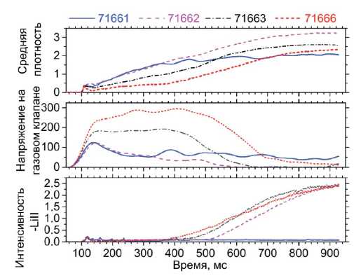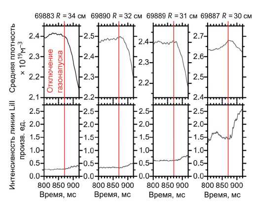 На рисунке 3 показаны эволюции во времени средней плотности плазмы после отключения клапана в серии разрядов после литиизации. Во всех разрядах задавалась программа для поддержания средней плотности на уровне 2.5⋅1019 част/см3. Однако в первом разряде из-за сильной сорбции дейтерия не удалось выйти на эту величину, несмотря на полное открытие клапана газонапуска. Но уже во втором импульсе производительности клапана хватало для выхода на заданный уровень средней плотности, но при этом клапан также был полностью открыт. На рис. 3 виден быстрый распад плотности после отключения клапана. Однако эффект литиевого геттерирования падал от разряда к разряду.