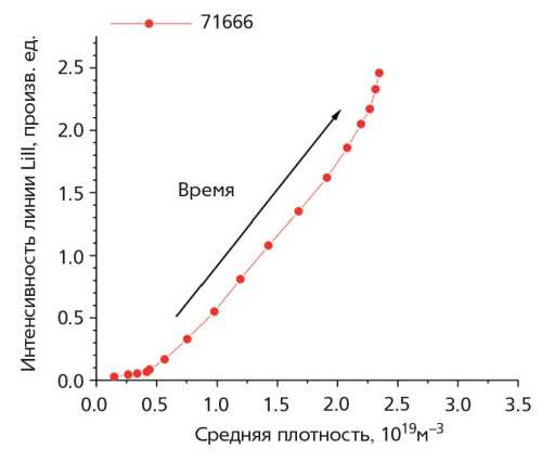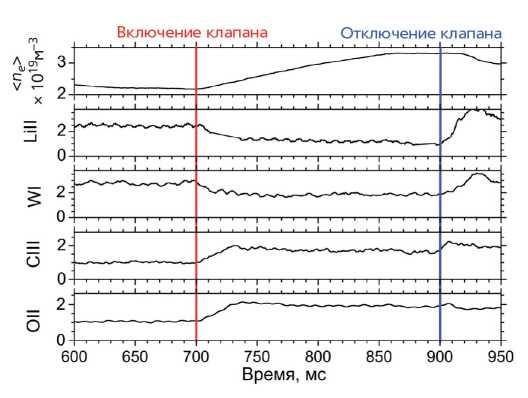 Следует особо отметить, что при этом концентрация самого лития в центре остается меньше 0.1%. На китайском диверторном токамаке EAST также проводилось напыление лития перед разрядами [26]. Отмечается сильное снижение уровня легких примесей углерода и кислорода. Эффективный заряд плазмы Zeff уменьшился до величины, меньшей 2. Рециклинг дейтерия после напыления снизился до 0.89, что дало возможность лучшего контроля плотности. Через 100 разрядов рециклинг возрос до 0.96.