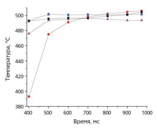 На рис. 2 приведено сравнение временного хода температуры в процессе охлаждения элемента до начала серии экспериментов и после 5 процессов напыления. Видно, что длительность плато температуры, соответствующая времени фазового перехода лития из жидкого в твердое состояние сократилось на 71 с. Поскольку было известно, что первоначально было заправлено 16 г лития, то потеря массы лития за одну литиизацию оценивалась по относительному сокращению длительности плато температуры как δm = 16/5(226—155) / 226 = 1 г.