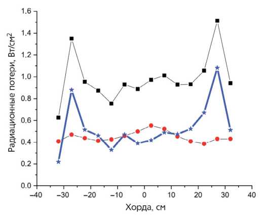 Рис. 36. Профили хордовых сигналов пироэлектрических болометров и полупроводниковых датчиков AXUV для разряда 71673 с доминированием лития. Прямоугольники — данные пироэлектрического болометра, кружки — данные AXUV (увеличенные в 1,54 раза), звездочки–разность между ними.
