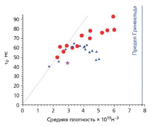 В чистых условиях удается значительно продвинуться в область больших плотностей вплоть до 0.8 от предела Гринвальда. При этом энергетическое время значительно возрастает при работе в режимах Improved Ohmic Confinement (IOC).