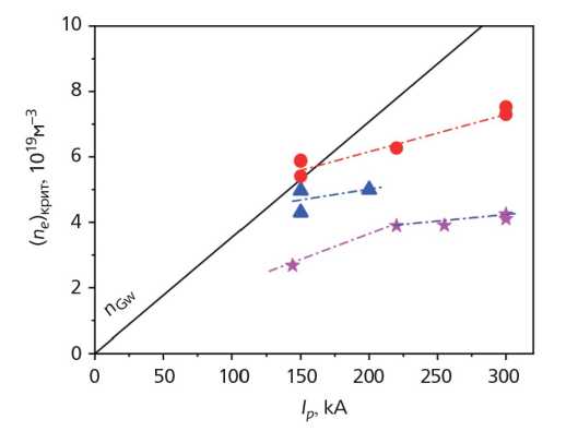 Рис. 38. Зависимости от тока разряда максимально достижимых плотностей в омических разрядах при работе Т-10 с диафрагмами: углеродной — синие треугольники, вольфрамовой — фиолетовые звездочки и литиевой — красные кружки.