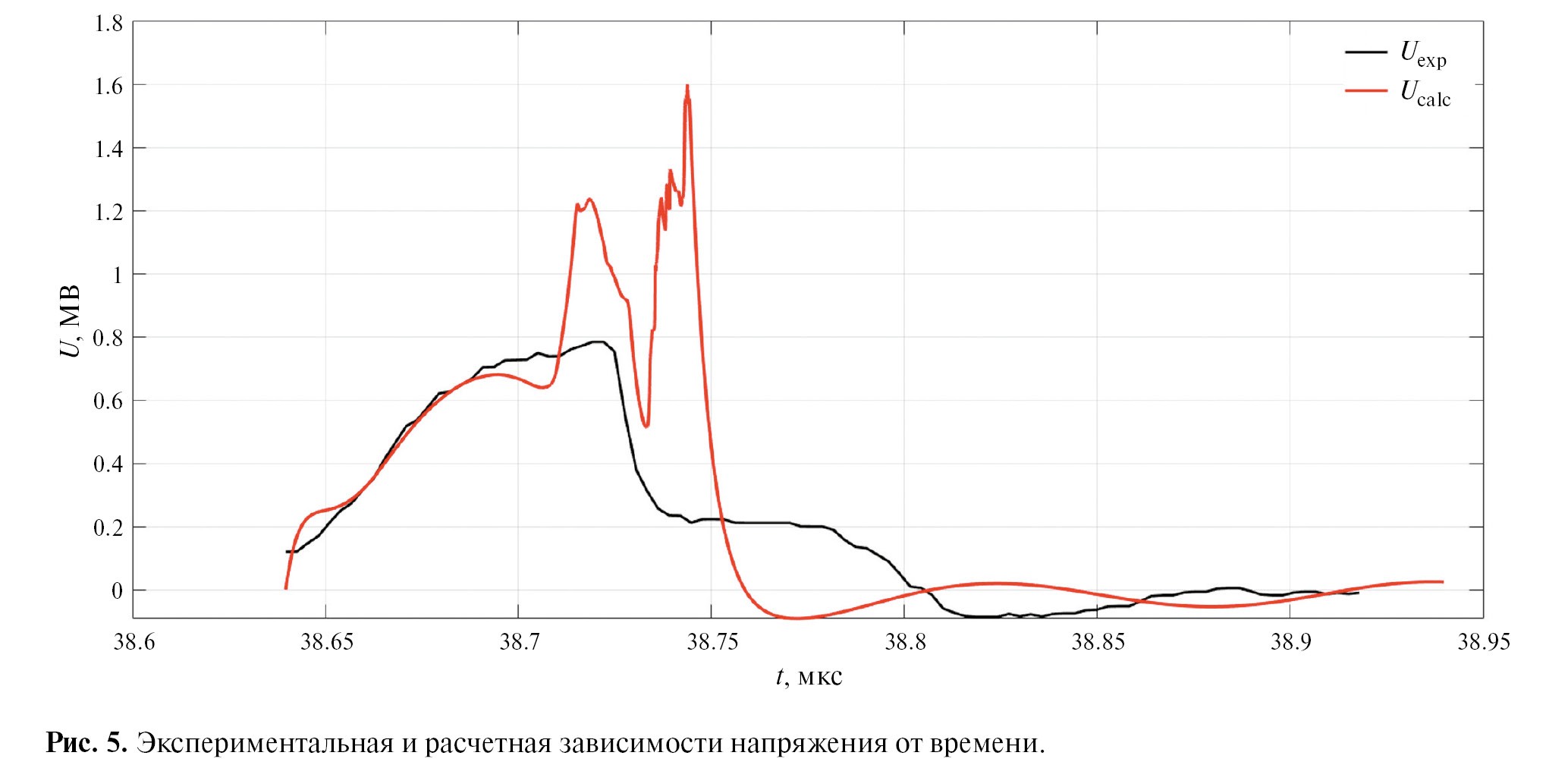 Сравнивая кривые, представленные на рис. 5, можно отметить, что не удалось достичь полного согласования экспериментальной и расчетной зависимостей напряжения. Подъем расчетной кривой напряжения в начале в момент времени 38.64–38.65 мкс связан с поведением производной тока, которое вызвано перегибом экспериментального тока в моменте 38.65 мкс (см. рис. 4). Но наиболее важное отличие расчетной кривой от экспериментальной состоит в том, что у расчетной кривой имеется пик (двойной) напряжения, связанный с пинчеванием (уходом тока на малый радиус) и соответствующим ростом индуктивности, что обычно имеет место в Z-пичах и плазменном фокусе. У экспериментальной же кривой такого пика нет или же он распределен на большие времена (и, значит, пинчевание происходит более медленно). Подчеркнем, что в наших расчетах мы варьировали плотность газа в широких пределах и варьировали распределение газа в момент включения тока, и даже таким образом не смогли добиться согласования расчетной и экспериментальной кривых напряжения. Можно указать некоторые причины, возможно, влияющие на отличие этих кривых. Во-первых, различие между экспериментальной и расчетной кривыми напряжения можно объяснить неучетом в расчете трехмерных эффектов, которые могут иметь место в эксперименте. В расчетах плазменного фокуса и МАГО получено хорошее согласие описания динамики плазмы в 2D-моделировании с экспериментом [18, 20, 30] и трехмерность не оказывала заметного влияния. Однако в этих экспериментах проводилась тщательная подготовка внутренней поверхности вакуумной камеры, которая обрабатывалась “тренировочными” импульсами, что уменьшало развитие азимутально несимметричных возмущений (несимметричных пробойных явлений, филаментации тока) в плазменной оболочке. Чем тщательнее велась эта подготовка, тем лучше было согласие 2D-расчетов с экспериментом. При работе систем с импульсным напуском газа проводить такие “тренировочные” импульсы затруднительно. Возможно, кроме того, что причина размытия пика напряжения на экспериментальной кривой связана с тем, что измерение коротких импульсов напряжения в эксперименте является очень сложной задачей и при этом в экспериментах иногда наблюдается растягивание «хвостов» сигнала.