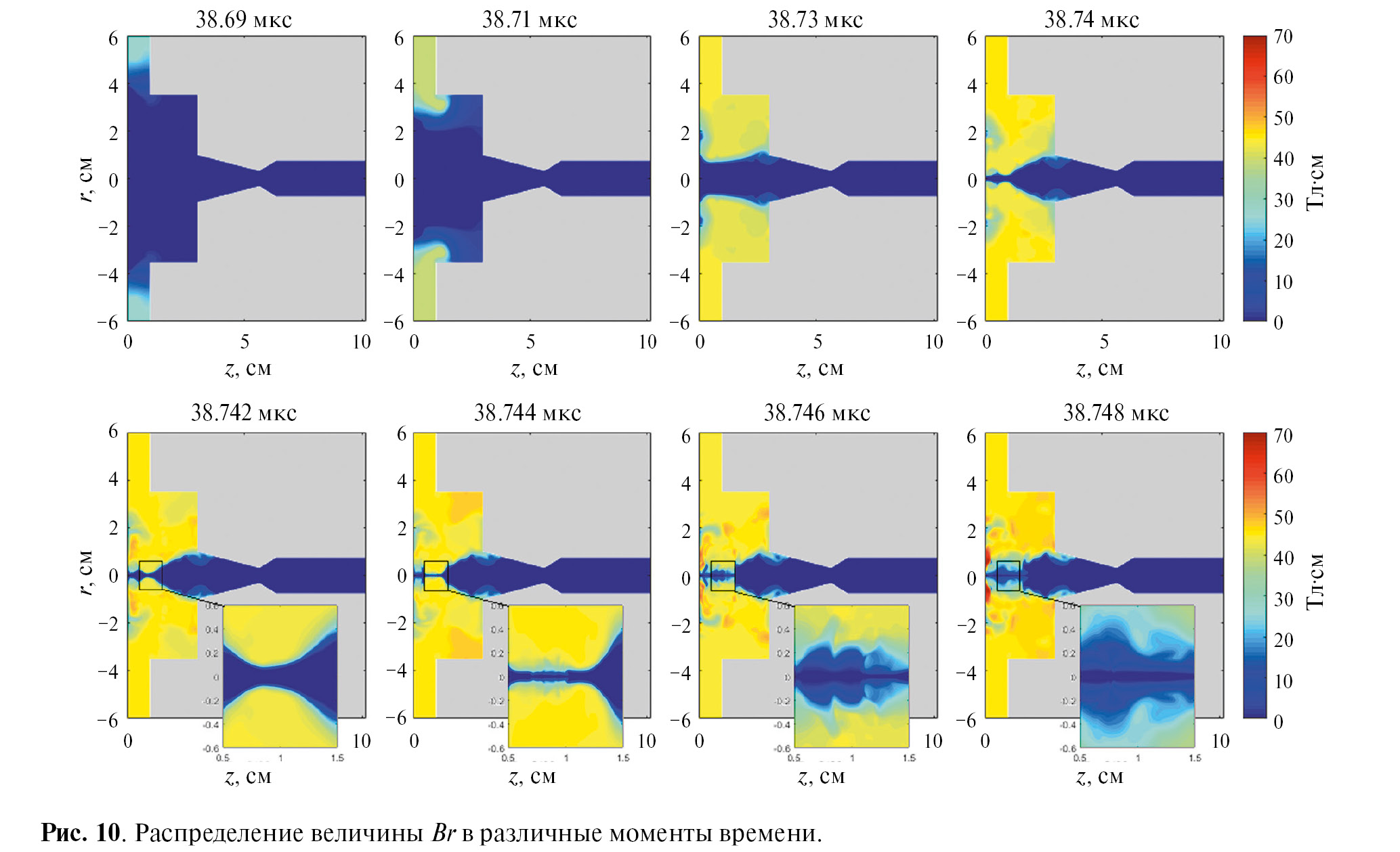 На рис. 10 приведено распределение величины Br на различные моменты времени до и после образования пинча. На увеличенных фрагментах, представленных на рисунке, видно, что ток Br, несущий магнитное поле, достаточно близко подходит к оси; так на момент времени 38.742 мкс, соответствующий образованию плазменной перетяжки, он достигает радиуса 0.1 см (при этом магнитное поле достигает величины B ≈ 4 МГс), а в момент 38.744 мкс, соответствующий сбросу массы из перетяжки, этот ток проникает еще глубже – до радиуса 0.02–0.03 см (магнитное поле достигает величины B ≈ 5.5–6 МГс). В последующие моменты времени наблюдается уменьшение магнитного поля в области пинчевания.