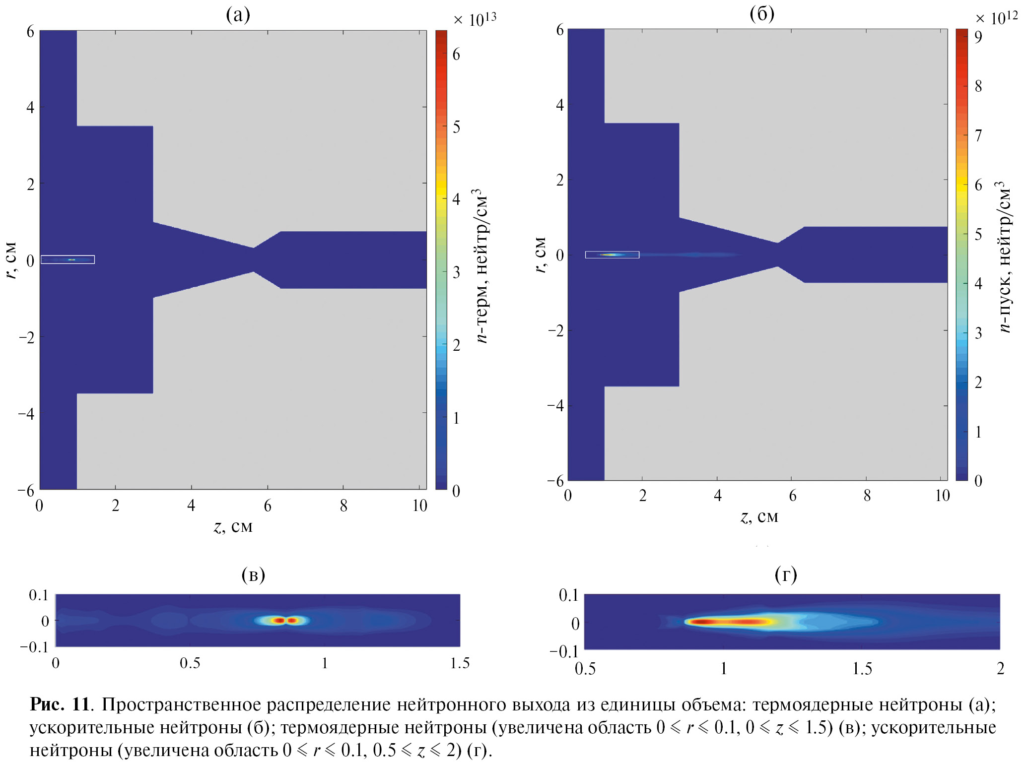 На рис. 11 приведено полученное в расчете пространственное распределение выхода термоядерных и ускорительных нейтронов из единицы объема по расчетной области. Области, выделенные на рис. 11а, б рамкой, ниже даны с увеличением. Из рис. 11в, г видно, что длина области генерации ускорительных нейтронов вдоль оси z составляет примерно 0.7 см и существенно больше осевого размера области генерации термоядерных нейтронов, которая составляет примерно 0.2 см. При этом радиусы области генерации близки и составляют примерно 0.03 см для ускорительных нейтронов и 0.02 см для термоядерных нейтронов.