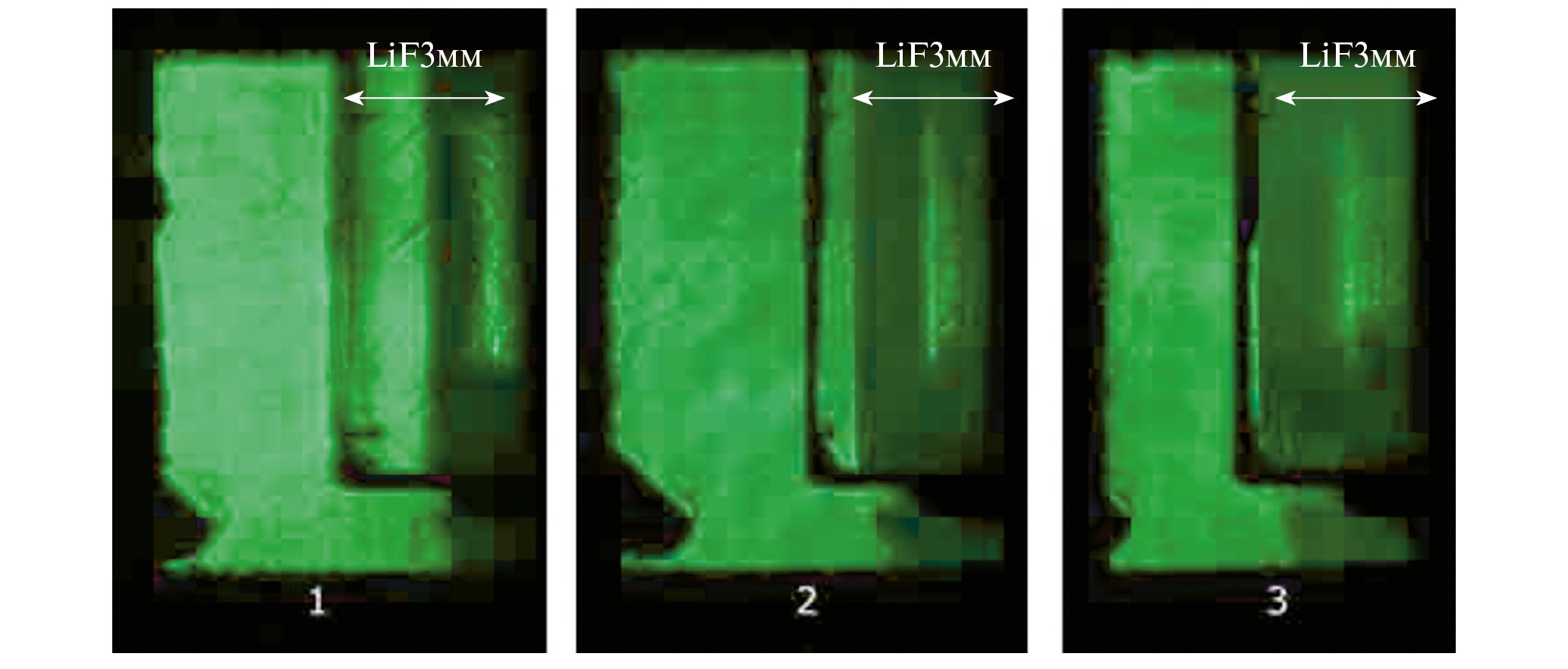 Для регистрации движения ударника использовалось теневое фотографирование. Для получения трех теневых кадров в каждом выстреле использовалась лазерная подсветка тремя пучками импульсного лазера SL-233 на длине волны 0,532 мкм с длительностью зондирующего импульса 0,1 нс. Интервал между кадрами варьировался в разных выстрелах от 13 до 6 3 нс. Лучи лазера были направлены перпендикулярно плоскости рис. 1 вблизи ударника, и в случае использования – LiF так же перпендикулярно плоскости рис. 1. Оптическая система обеспечивает пространственное разрешение по объекту ±50 мкм для первого и третьего кадра и ±25 мкм для второго кадра. Для возможности раздельной регистрации эти лучи проходят вблизи ударника под разными углами.