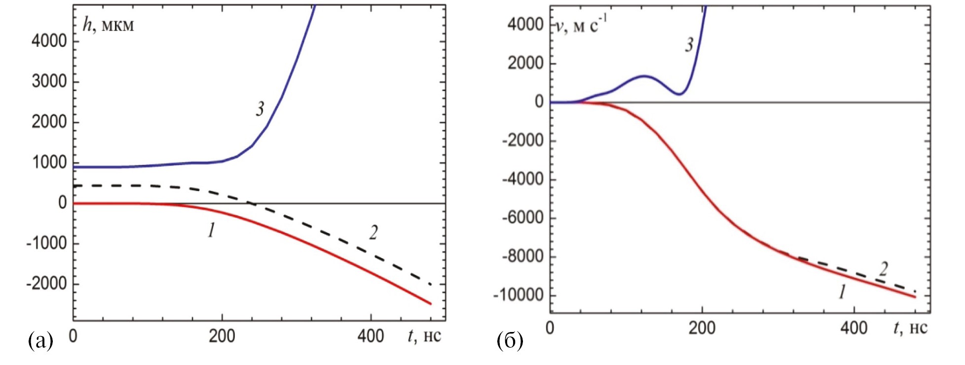 Очень интересно было бы исследовать разлет ударника в вакуум с помощью интерферометрических измерений, как это сделано на Z-машине [5]. Мы предпринимали такие попытки, однако, в наших экспериментах происходило такое неоднородное разрушение тыльной поверхности ударника, что полученные сигналы не удавалось интерпретировать.
