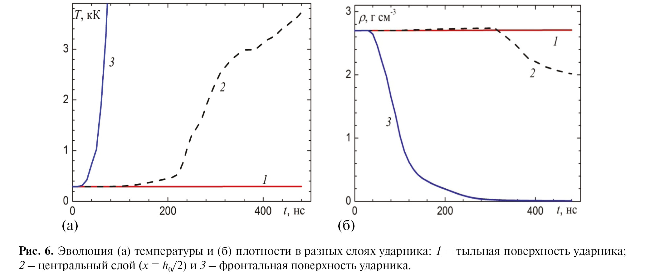 На рис. 10 для точки, расположенной на тыльной поверхности ударника на оси симметрии, показаны зависимости от времени скорости, плотности и температуры, полученные в разных расчетах. Из приведенных графиков видно, что после того, как волна возмущения достигает тыльной поверхности ударника, скорость и температура данного участка в обоих расчетах в дальнейшем практически не меняются. В расчете 1 скорость тыльной поверхности ударника составляет около 8,9 км/с, а температура – около 770 К. В расчете 2 скорость тыльной поверхности ударника составляет около 7 км/с, а температура – около 920 К. В то же время плотность данного участка ударника для различных моделей ведет себя по-разному: для модели 1 плотность быстро убывает (от пикового значения 3.5 г/см3 в момент времени 174 нс, до 0.43 г/см3 в момент времени 400 нс); для модели 2 плотность уменьшается гораздо медленней (от пикового значения 3.4 г/см3 в момент времени 157 нс, до 1.9 г/см3 в момент времени 400 нс).