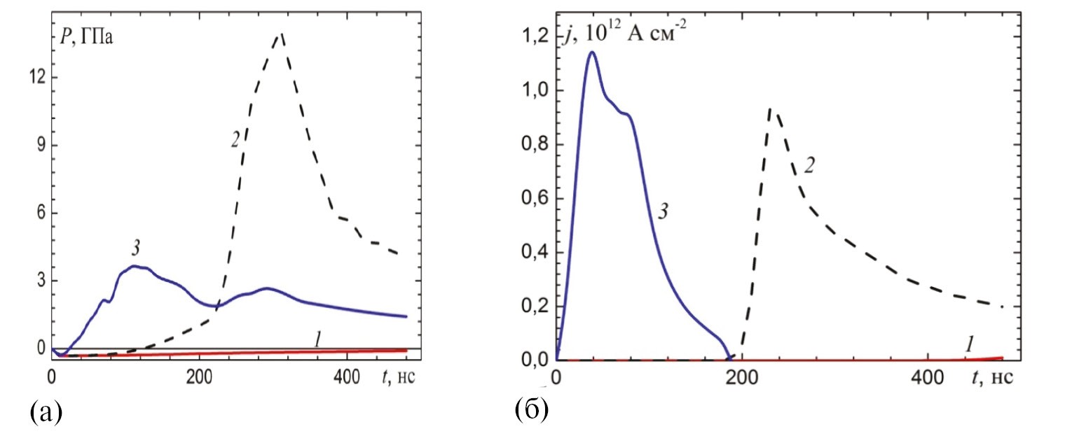 Рис. 7. Эволюция (а) давления и (б) плотности тока в разных слоях ударника: 1 – тыльная поверхность ударника; 2 – центральный слой (x = h0 /2) и 3 – фронтальная поверхность ударника.