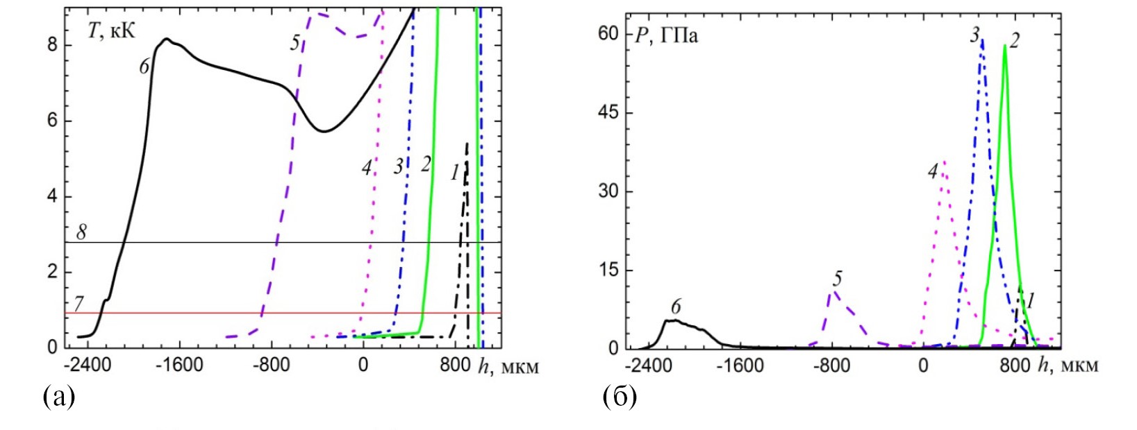 Рис. 8. Распределение (а) температуры и (б) давления по толщине ударника на различные моменты времени: 1 – 80; 2 – 160; 3 – 200; 4 – 240; 5 – 340 и 6 – 480 нс; горизонтальные линии: температуры 7 – плавления и 8 – кипения алюминия при атмосферном давлении. Координата фронтальной поверхности ударника 900 мкм, тыльной – 0 мкм.