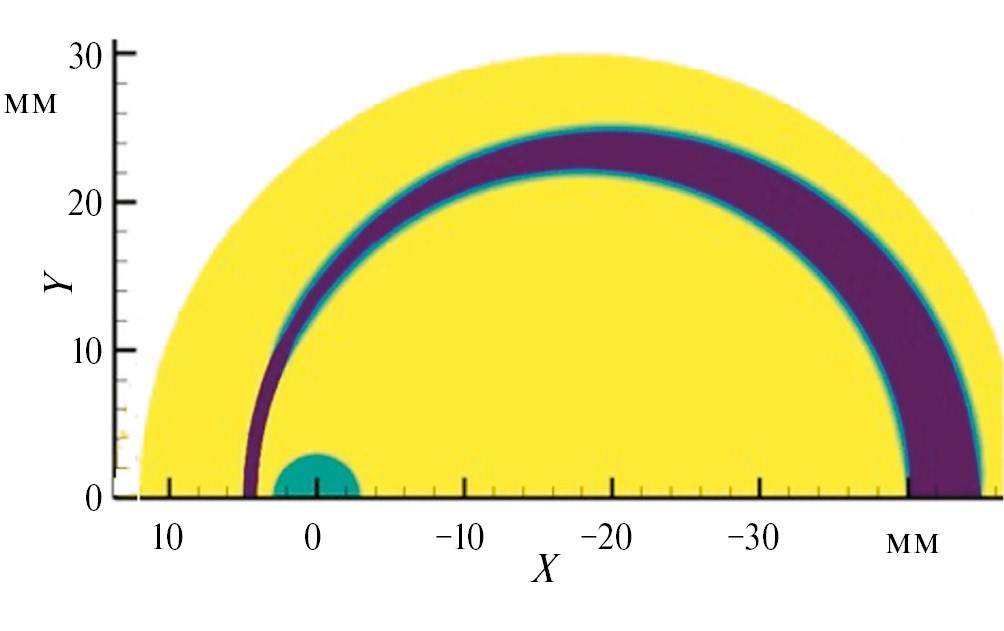 Был проведен двумерный расчет в плоскости XY, перпендикулярной стержню. Расчетной областью была внутренность полукруга радиусом 3 мм (рис. 9). В расчетной области катод – это круг с центром в 0, радиус равен 3 мм, на оси ОХ в начальный момент времени ударник занимал область от 4 мм до 5 мм.