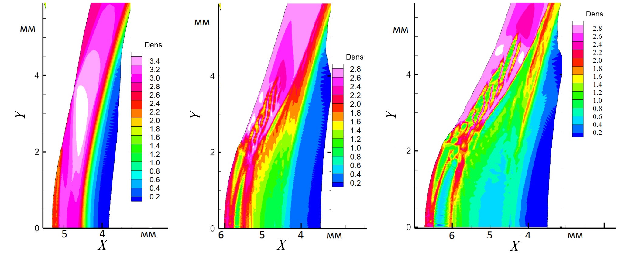 Рис. 11. Р аспределение плотности на участке анода в моменты времени 200нс (слева), 300нс (центр) и 400нс (справа) для расчета 2. На оси Ох в начальный момент времени ударник занимал область от 4 мм до 5 мм.