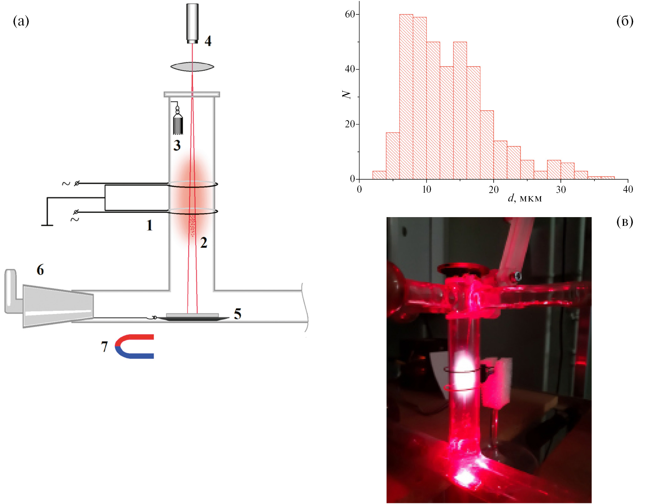 Рис. 1. а) Схема экспериментальной установки. Обозначения: 1 – индуктор; 2 – пылевая структура; 3 – контейнер для инжекции пылевых частиц в разряд; 4 – система подсветки; 5 – каретка с лежащим на ней предметным стеклом для сбора частиц; 6 – вакуумный кран для извлечения каретки; 7 – магнит для передвижения каретки внутри трубки. б) Гистограмма распределения размеров засыпного порошк. в) Фотография установки.