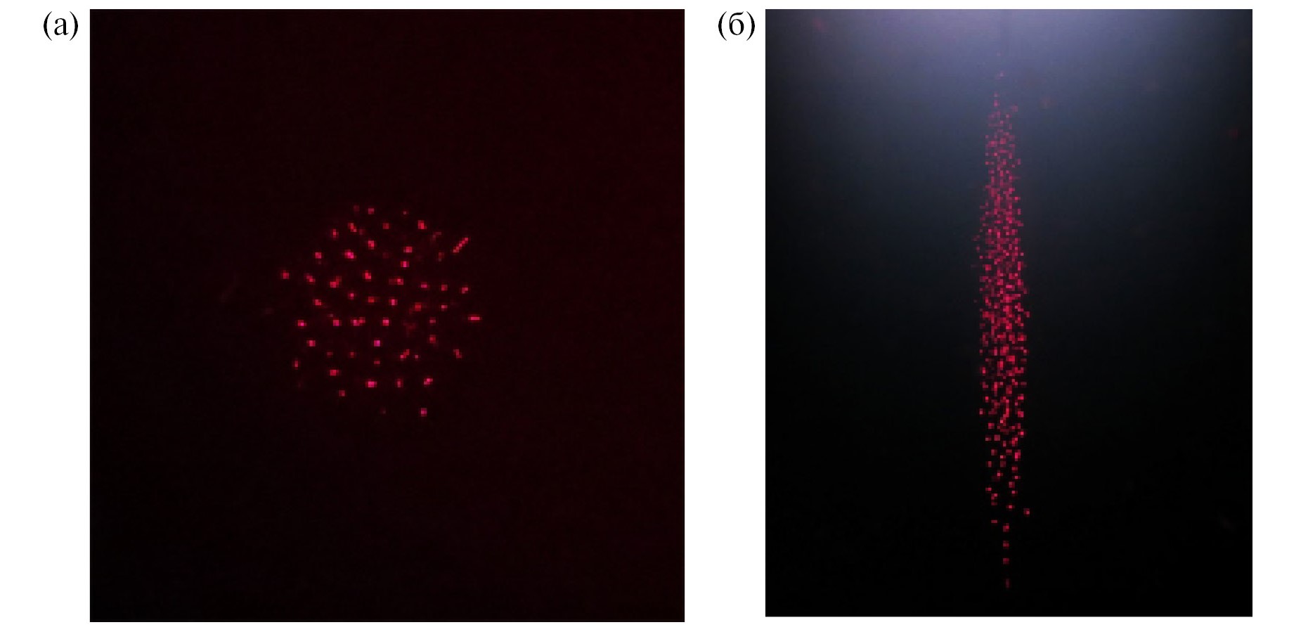Рис. 2. Структура в пылевой ловушке в ВЧИ-разряде, созданная из полидисперсных частиц кварца. Условия: газ неон, давление – 0.4 Торр, напряжение – 180 В, частота ВЧ-генерации – 40 МГц, диаметр трубки – 1.9 c м. а) Фото горизонтального сечения пылевой структуры. Высота изображения – 4.7 мм. б) Фото вертикального диаметрального сечения пылевой структуры. Высота изображения – 18 мм.