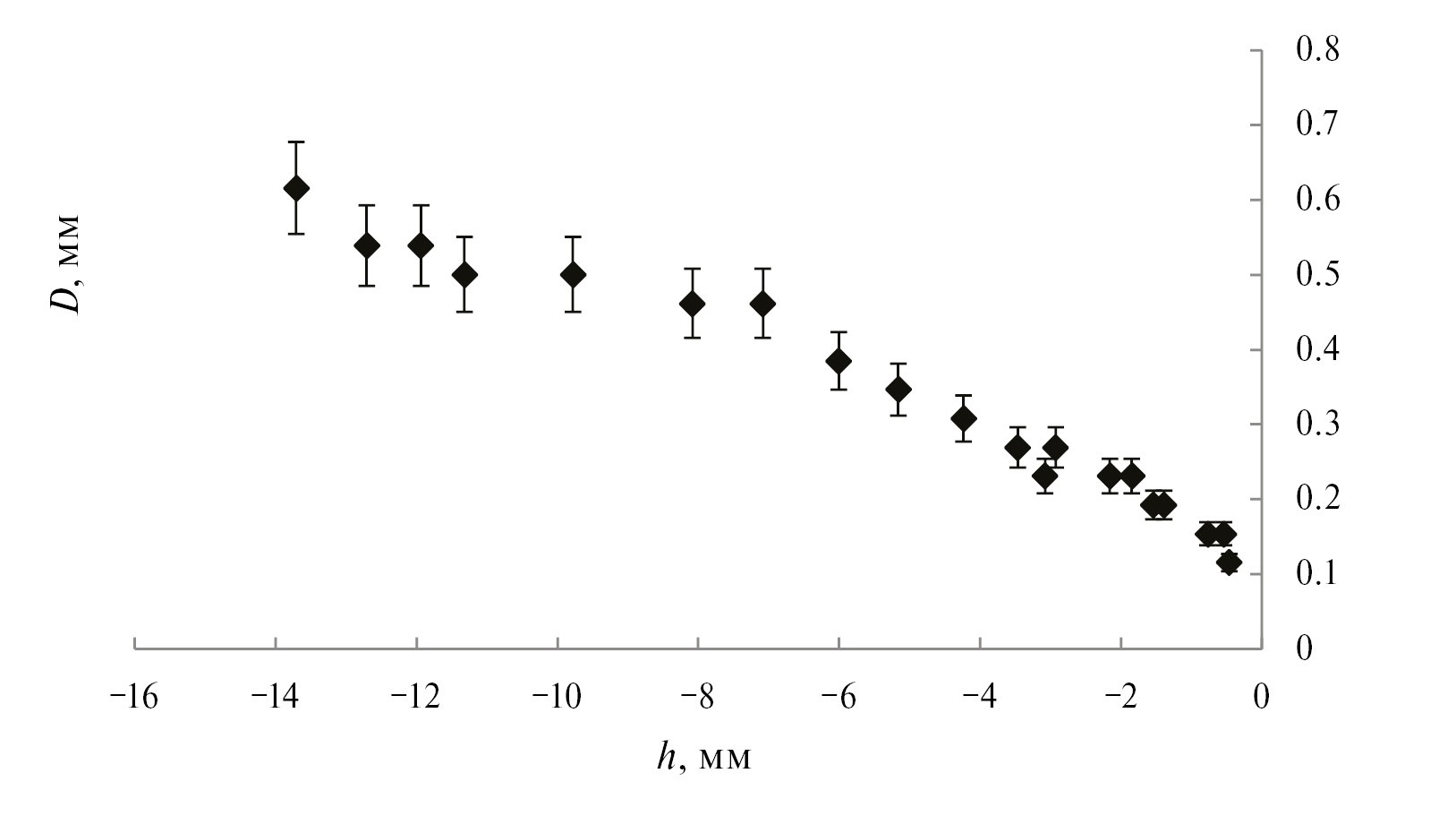 На рис. 5 представлены продольные межчастичные расстояния D в плазменно-пылевой структуре в зависимости от расстояния от индуктора (от вертикальной координаты), при одном значении давления газа. Изменение продольного расстояния оказалось существенным, и, в зависимости от условий, оно меняется до 6 раз на длине структуры до 1.5 см. Заметим, что уверенного изменения радиального расстояния во всем диапазоне давления мы не обнаружили, что соответствует [13, 14]. Мы полагаем, что при планировании изучения динамики вращения пылевых структур в ВЧИ-разряде в магнитном поле, сведения о продольном градиенте межчастичного расстояния могут быть полезны. Измеренное продольное расстояние между частицами менялось от 0.1 мм в непосредственной близи от индуктора до примерно 0.8 мм на диффузном крае при всех использованных давлениях.