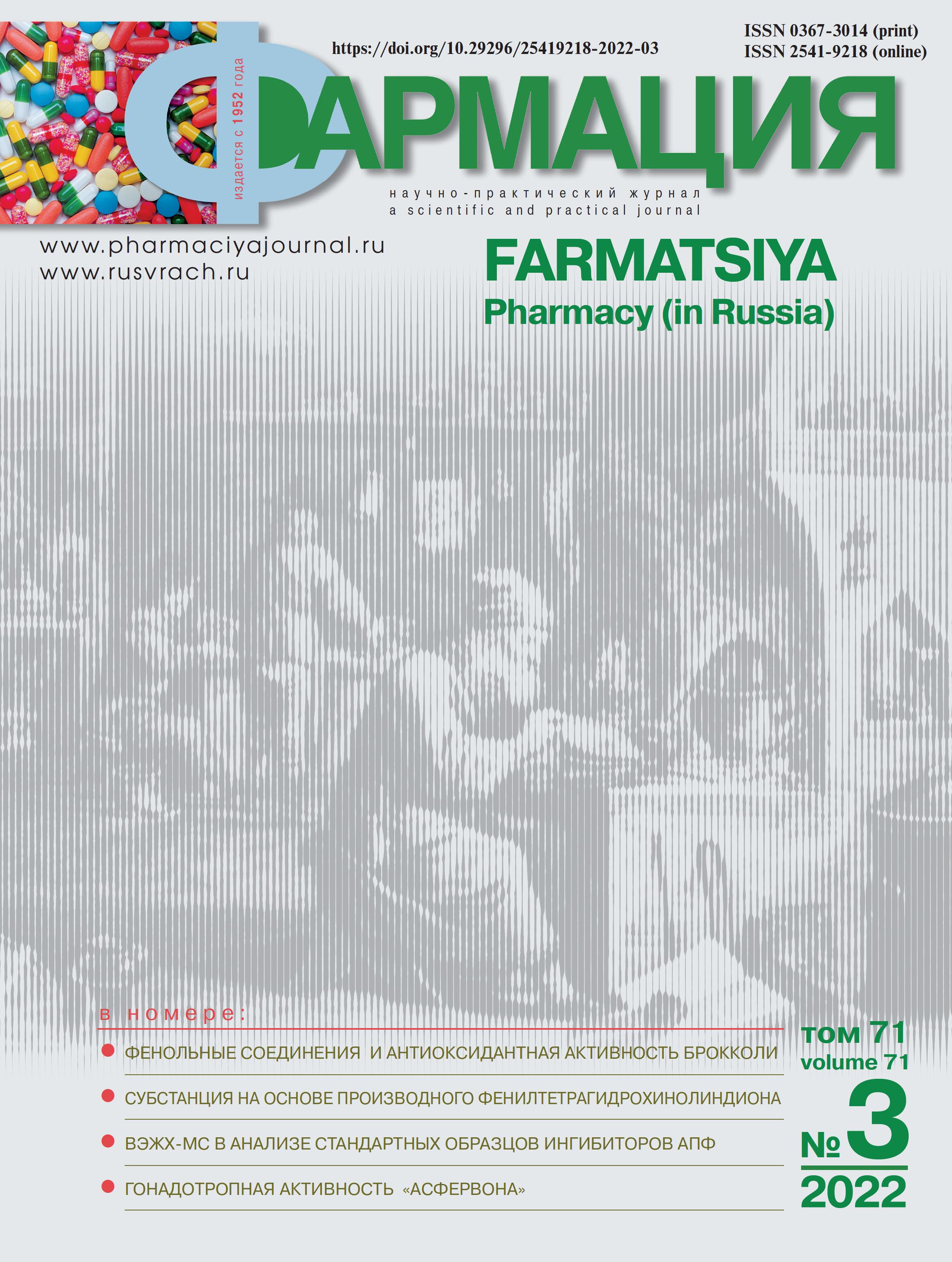 Introduction. Brassicaceae vegetables are considering as functional foods owing to their unique chemical composition health-promoting properties. In particular, broccoli (Brassica oleracea L. var. italica) has been particularly prizing for their highly amount of bioactive constituents, as such secondary metabolites: glucosinolates, phenolic compounds. Numerous in vitro and in vivo studies demonstrated that broccoli possess various biological properties, including antioxidant, anticancer, anticancer, antimicrobial, antiinflammatory, antidiabetic activities. Objective: to study the qualitative composition and quantitative content of phenolic compounds and determination of the antioxidant activity in broccoli. Material and methods. The phenolic profile was determined by methods: chromatography in a thin sorbent layer, spectrophotometry, ultra-performance liquid chromatography coupled with photodiode array and triple-quadrupole mass spectrometry detector (MS/MS). Antioxidant activity determined by coulometry using electrically generated bromine. Results and discussion. The component composition of broccoli is represented by flavonoids (rutin, quercetin), derivatives of ferulic and sinapic acids, glucosinolates (4-methoxyglucobrassicin, neoglucobrassicin). The content of tannins was 0.73±0.06%, the total quantity of hydroxycinnamic acids converted to chlorogenic acid was 2.81±0.053% in absolutely dry raw materials of broccoli cabbage. Antioxidant activity was 2749.06±113.69 mg of rutin/100 g of dry raw material. Conclusion. Broccoli is rich in bioactive compounds and are a potential source of natural antioxidants.