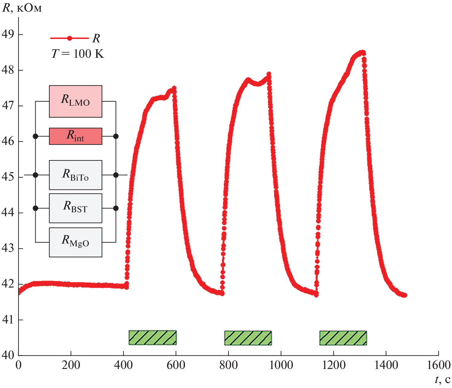 The temperature behavior of the LaMnO3/Bi4Ti3O12/Ba0.4Sr0.6TiO3/MgO heterostructure resistance was studied. Within the temperature range of 120–180 K, an anomalous region with two resistance maxima was found. Below 120 K, a transition to a metallic character of conductivity occurs. It was revealed the significant increase of the heterostructure resistance under the influence the green light radiation.