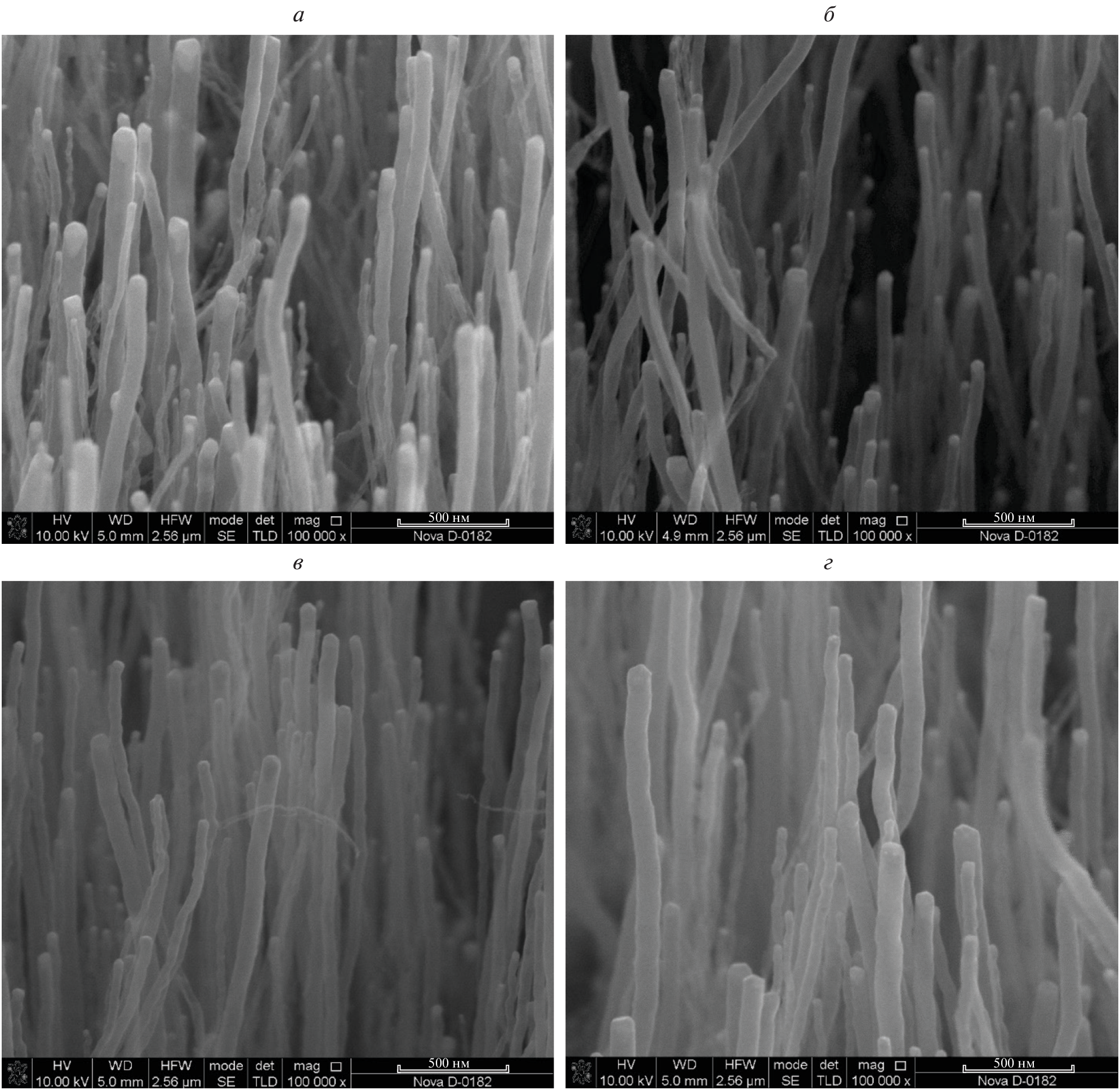The piezoelectric properties of vertically aligned carbon nanotubes (CNTs) are characterized using the piezoresponse force microscopy method. Dependence of piezoelectric properties on the nitrogen concentration is established. It is shown that CNTs have predominantly longitudinal polarization due to the direction of the dipole moment in the bamboo-like “bridges”. It has been established that a decrease in the growth temperature from 690 to 645°С leads to an increase in the piezoelectric strain coefficient of CNTs from 4.5 to 21.2 pm ⋅ V–1. The obtained results can be used in the development of energy-efficient nanopiezotronic devices.