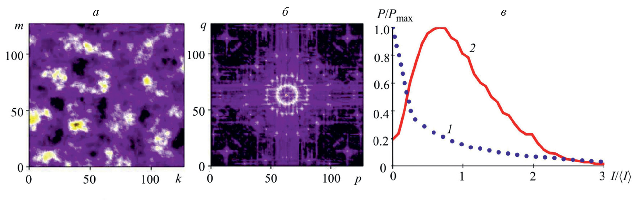 Рис. 1. Характеристики спеклоподобного поля (расчет): распределение интенсивности (а), структура пространственного спектра (б) (p, q — пространственные частоты), гистограммы распределения интенсивности (в) (1 — релеевская (A = 0) и 2 — нерелеевская (A = 2) статистика).