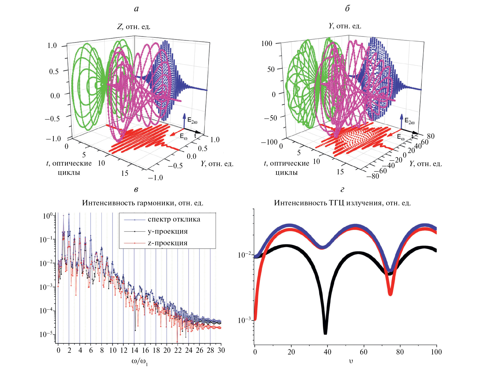 В качестве примера применения описанного непертурбативного подхода к расчету отклика одиночного атома при конкретных параметрах поля на рис. 1 представлены результаты расчета спектра тока отклика атома аргона на воздействие двухчастотного лазерного поля, образованного линейно поляризованными первой и второй гармониками Ti:Sa лазера (см. рис. 1а). Явный вид тока атомного отклика, рассчитанный с помощью формулы (2), представлен на рис. 1б. Видно, что спектр состоит из последовательности четных и нечетных гармоник поля, причем амплитуды каждой из гармоник обладают ненулевыми проекциями на ортогональные оси (см. рис. 1в). Важно отметить, что спектр не ограничивается подбарьерными и околобарьерными гармониками (гармониками, энергия фотона которых меньше или равна энергии ионизации атома), несмотря на то что модельная структура уровней атома [16] не учитывает динамику населенностей квазиуровней непрерывного спектра атома (рис. 1в). Действительно, энергия ионизации атома аргона составляет величину 15.76 эВ, для излучения Ti: Sa лазера соответствует ~10-й гармонике поля, вместе с тем фотоэмиссионный спектр существенно шире. Кроме того, в спектре излучения присутствует ненулевой сигнал на “нулевой” частоте, который в случае воздействия лазерных импульсов фемтосекундной длительности соответствует ТГц диапазону (рис. 1г). Отклик в ТГц части также имеет ненулевые проекции на перпендикулярные оси.
