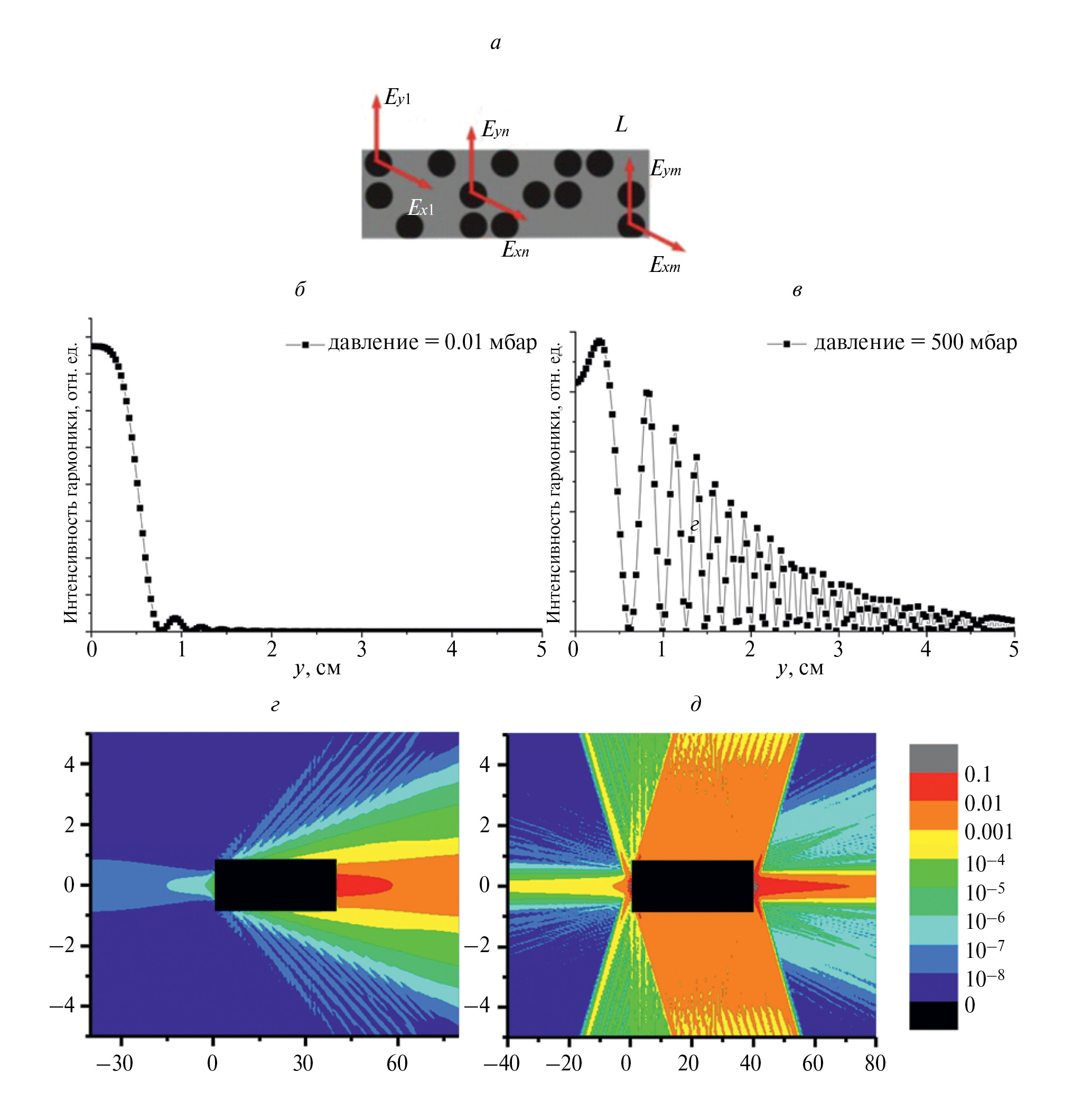 Рис. 2. Схематическое изображение газа (серый прямоугольник) с атомами (черные кружки), генерирующими электромагнитное поле (красные стрелки указывают две его проекции) (а). Радиальное распределение интенсивности 6-й гармоники, рассчитанной для аргонового газа длины 1 см при значении давления 0.01 мбар (б) и 500 мбар (в) в среде. Расчет проводился для лазерного излучения, сформированного из первой и второй гармоник Ti:Sa лазера, интенсивность компонент поля µ01 = 0.1, µ01 = 0.1, длительности импульсов τ1 = τ2 = 30 фс, угол между поляризациями компонент поля Излучение на частотах 1 ТГц (г) и 11 ТГц (д), испускаемое протяженной аргоновой газовой средой. Черный прямоугольник показывает объем газовой камеры (длина 40 см, ширина 1.8 см). Параметры двухчастотного лазерного поля, образованного первой и второй гармониками Ti:Sa лазера, имеют вид µ01 = 0.1, µ02 = 0.0147 τ1 = τ2 = 30 фс, (разность фаз между компонентами двухчастотного поля). Цветом указана шкала интенсивностей генерируемого излучения в относительных единицах.