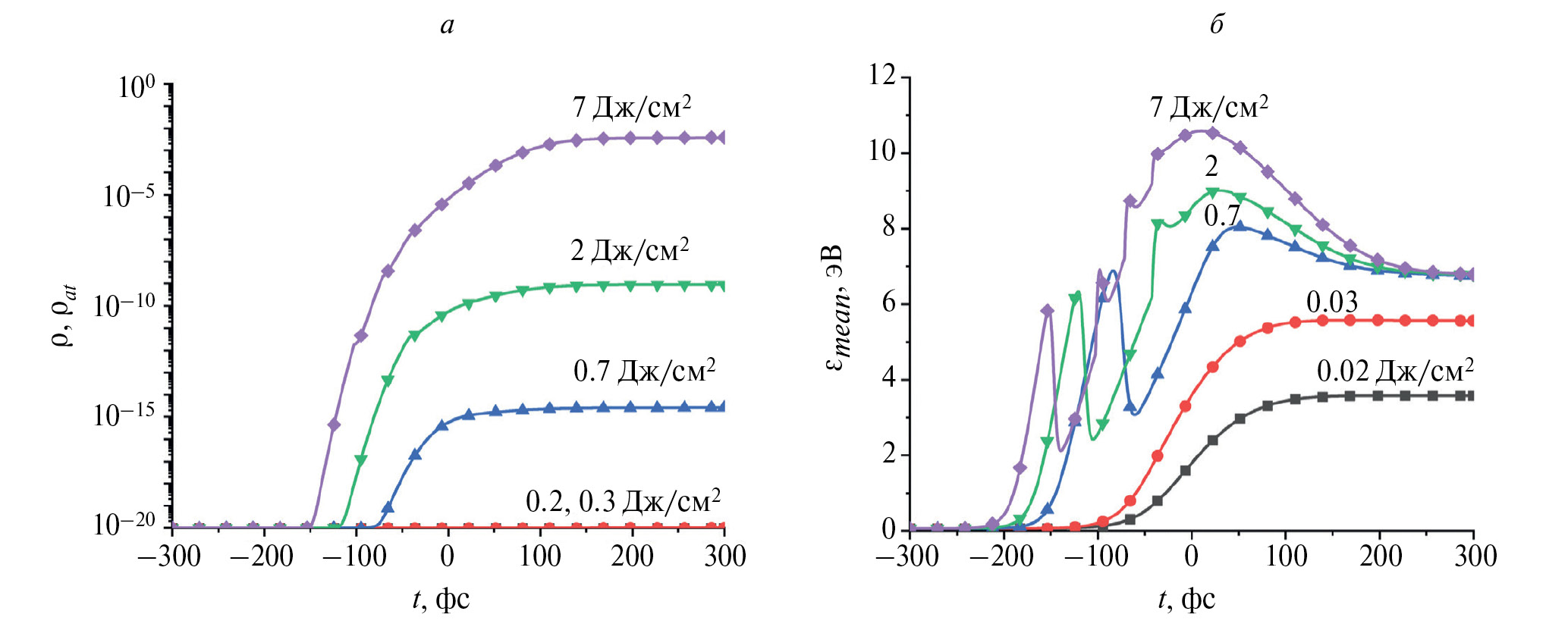 На рис. 1а представлена динамика плотности свободных носителей, индуцированных лазерным излучением, а на рис. 1б — динамика их средней кинетической энергии, рассчитанной по формуле (7). Даже при самом большом значении флюенса F = 7 Дж/см2, использованного в работе, плотность свободных носителей после прохождения импульса составляет не более 0.04 ρat, что свидетельствует о низком уровне возбуждения среды. Поэтому более тонкие факторы, влияющие на динамику носителей, например, изменение ширины запрещенной зоны или Оже-рекомбинацию, можно не учитывать.
