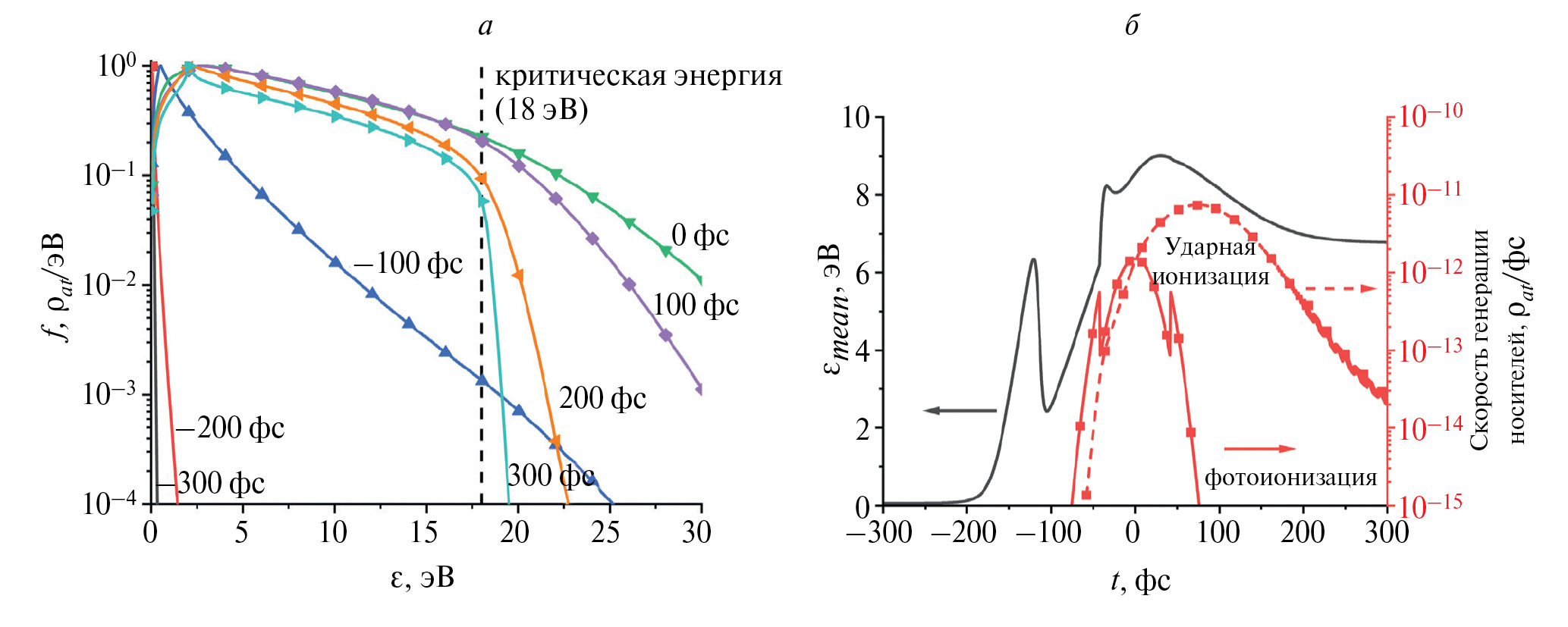 С середины импульса, как только носители достигнут критической энергии (для CaF2 она составляет εcr = 1.5Eg = 18 эВ), и до его окончания активно действует ударная ионизация, создающая высокую плотность носителей с энергией в области 2.1 эВ и понижающая ее в области > 18 эВ (рис. 2а). При этом формируется такое распределение носителей по энергии, что их средняя энергия выходит на значение 6.7 эВ, что составляет Примечательным является тот факт, что данное значение средней кинетической энергии (0.56 Eg) не зависит от параметров лазерного излучения: флюенса (от 0.02 до 7 Дж/см2, рис. 1б), длины волны (от 1.24 до 4.4 мкм), длительности (от 80 до 400 фс), а также ширины запрещенной зоны (от 6 до 12 эВ), что было подтверждено дополнительными расчетами.