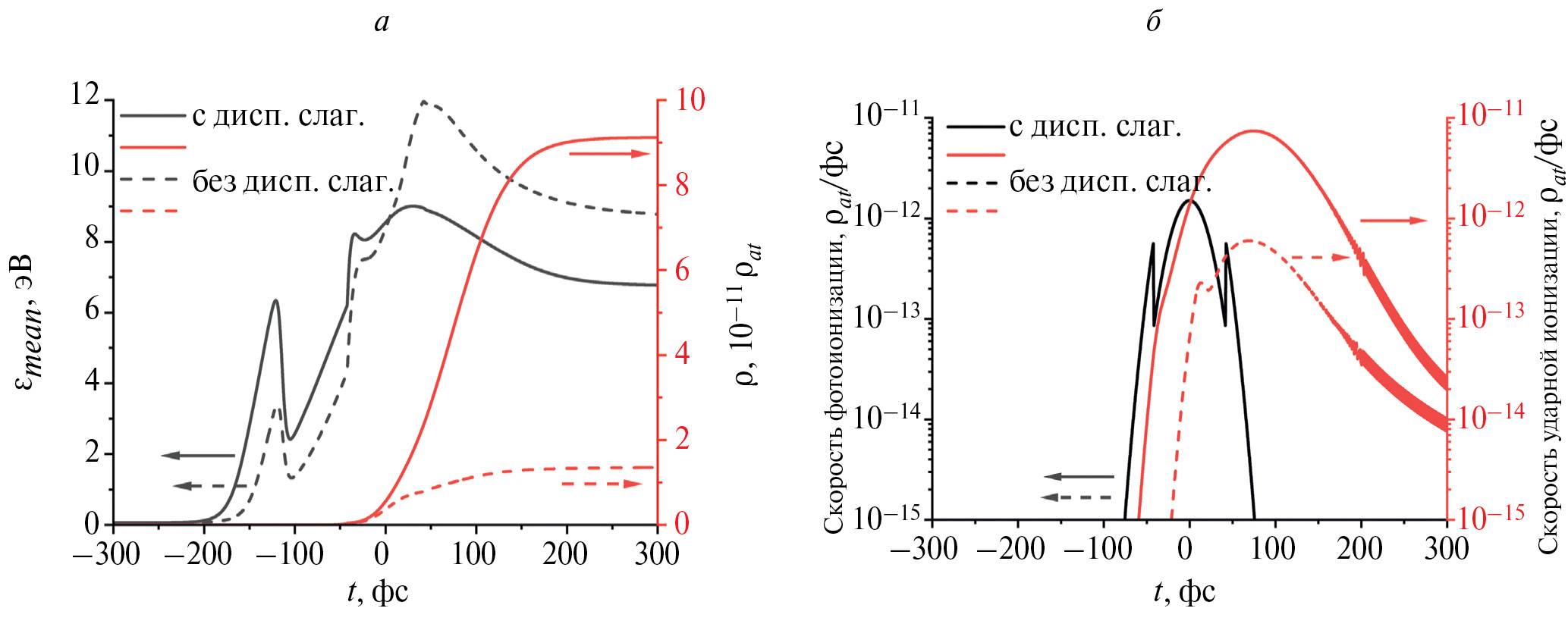Как было уже отмечено, существующие скоростные модели динамики свободных носителей учитывают только лазерный нагрев носителей, но не дисперсионное расплывание носителей по энергии. Чтобы выяснить важность учета этого слагаемого, была проведена серия расчетов, часть результатов которых приведена на рис. 3. Пренебрежение дисперсионным слагаемым приводит к понижению плотности генерируемых свободных носителей в 6.7 раза (при флюенсе лазерного излучения F = 2 Дж/см2). Причина этого состоит в сниженном действии ударной ионизации (рис. 3б), из-за чего создается меньшее количество носителей, а их средняя кинетическая энергия становится выше: с 0.56 Eg до 0.73 Eg при F = 2 Дж/см2 (рис. 3а). Ошибка в несколько раз в значении созданной после прохождения лазерного импульса плотности носителей и их средней кинетической энергии может негативно сказаться на предсказательной способности теоретических расчетов процессов релаксации запасенной в электронной подсистеме энергии, например, электрон-фононного рассеяния, объемного и поверхностного микроструктурирования вещества, люминесценции.